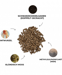 Kräutermischung 21 % (Isländisch Moos, Alantwurzel, Anis, Brombeerblätter, Fenchel süß, Malvenblätter, Spitzwegerichkraut, Salbei Officinalis, Thymian, Ysopkraut), Schwarzkümmelsamen (doppelt gecrackt) 17 %, Methylsulphonylmethan (MSM) 17 %, Karottenmehl, Johannisbrotschrot, Dolomit, Mariendistelöl